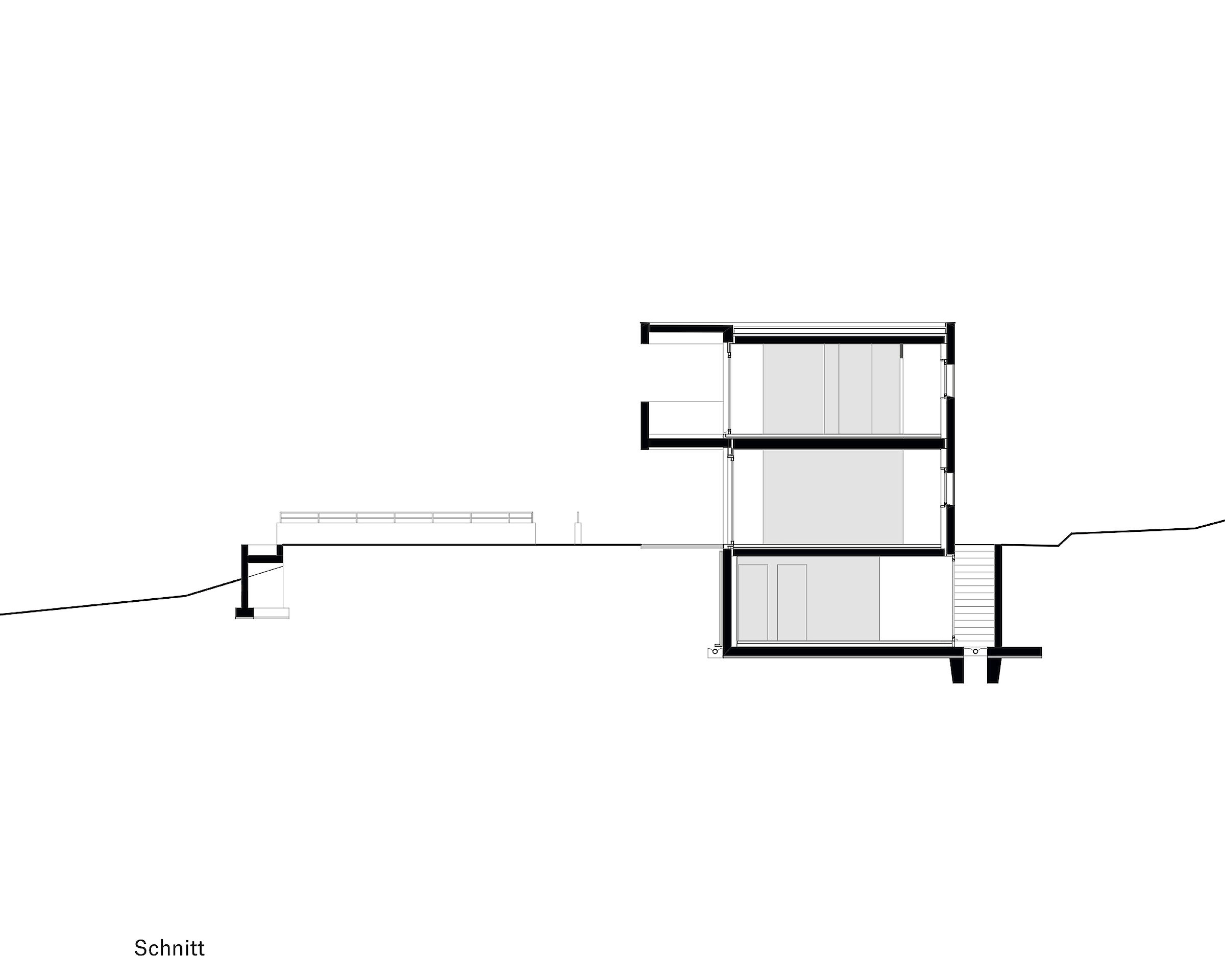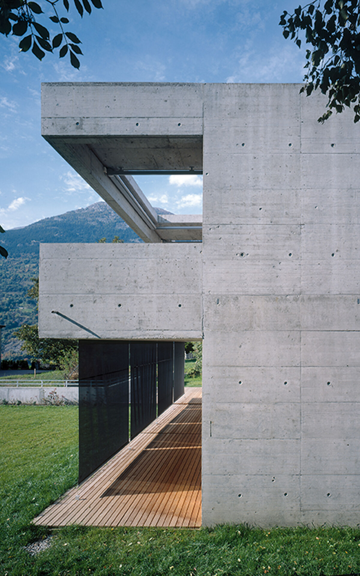 Auf einem sanft ansteigenden Plateau über der Stadt Brig gelegen, orientiert sich das Haus nach Südwesten längs ins offene Tal hinaus. Die durchgehende Balkonschicht im Obergeschoss betont zusätzlich die Hinwendung zur Sonne. Ein Betonrahmen über dem Balkon spendet Schatten und fasst den Kubus zusammen. Im Inneren folgt der Grundriss der strengen und doch offenen Ordnung des Baukörpers. Das Erdgeschoss ist ein einziger grosser Raum, der mit Schiebetüren unterteilt werden kann. Im Obergeschoss reihen sich die Zimmer entlang des fassadenseitigen Korridors auf.