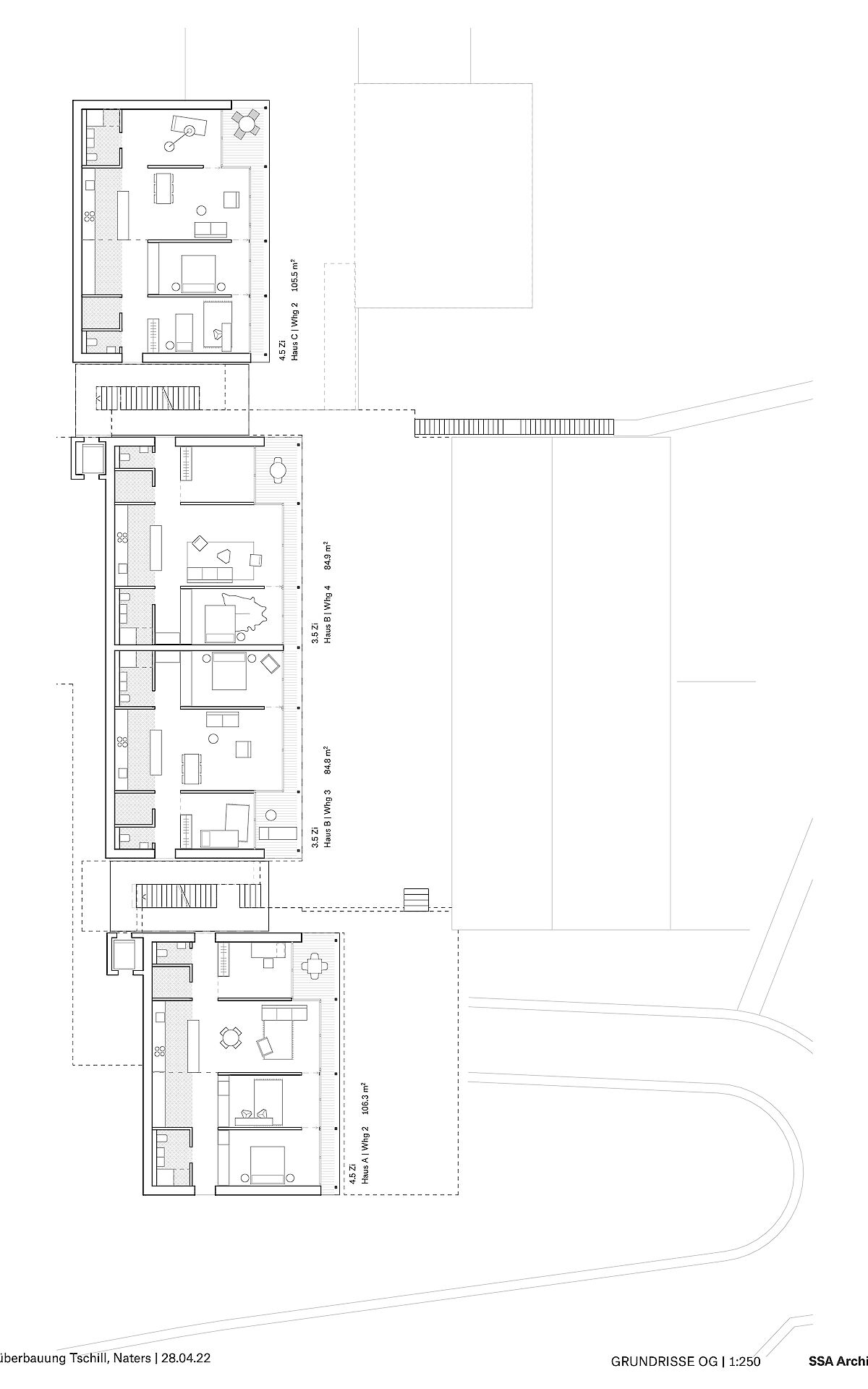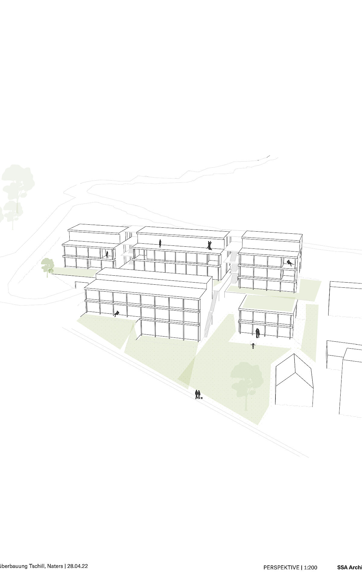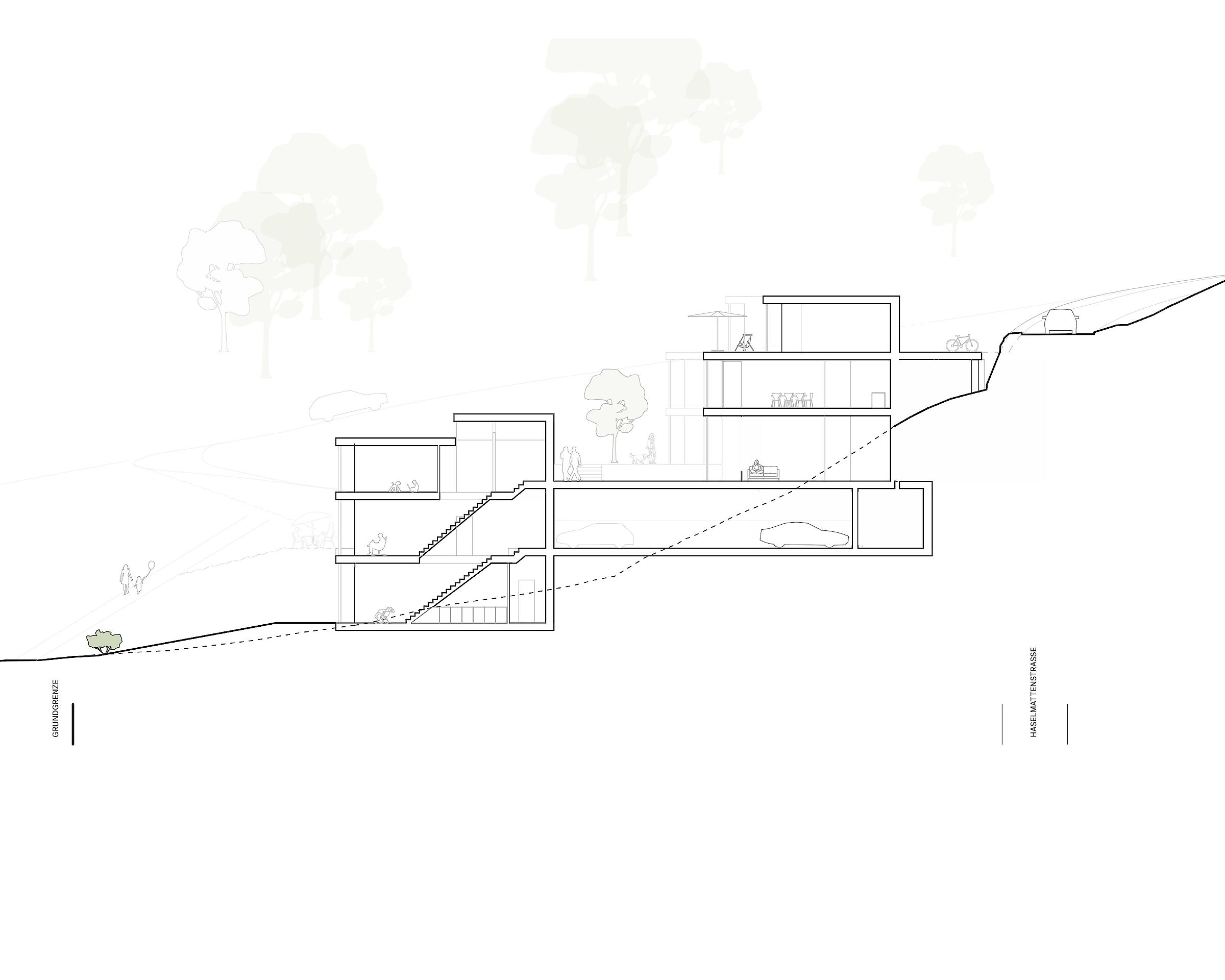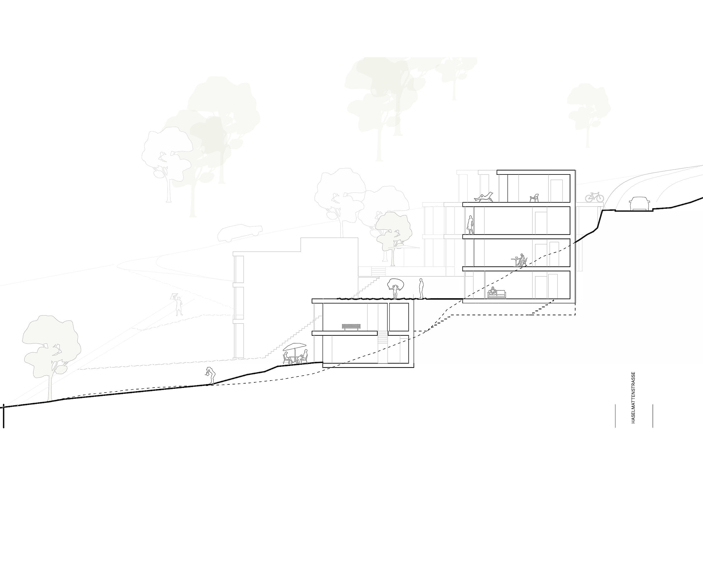 Aufgrund dieser ortsprägenden Topographie wurde eine spezielle Bebauungsform gewählt. Die Erschliessung der Bebauung erfolgt ab der Haselmattstrasse. An die bestehende Stützmauer der Strasse schliessen zwei mehrgeschossig Volumen, die sowohl Maisonette wie auch Geschosswohnungen aufnehmen, an. Zwischen den Bauten führt eine halboffen Treppenanlage auf die untere, zwischen den beiden Häuserzeilen liegende Ebene. Ab dieser Ebene werden die vier Reihenhäuser erschlossen.