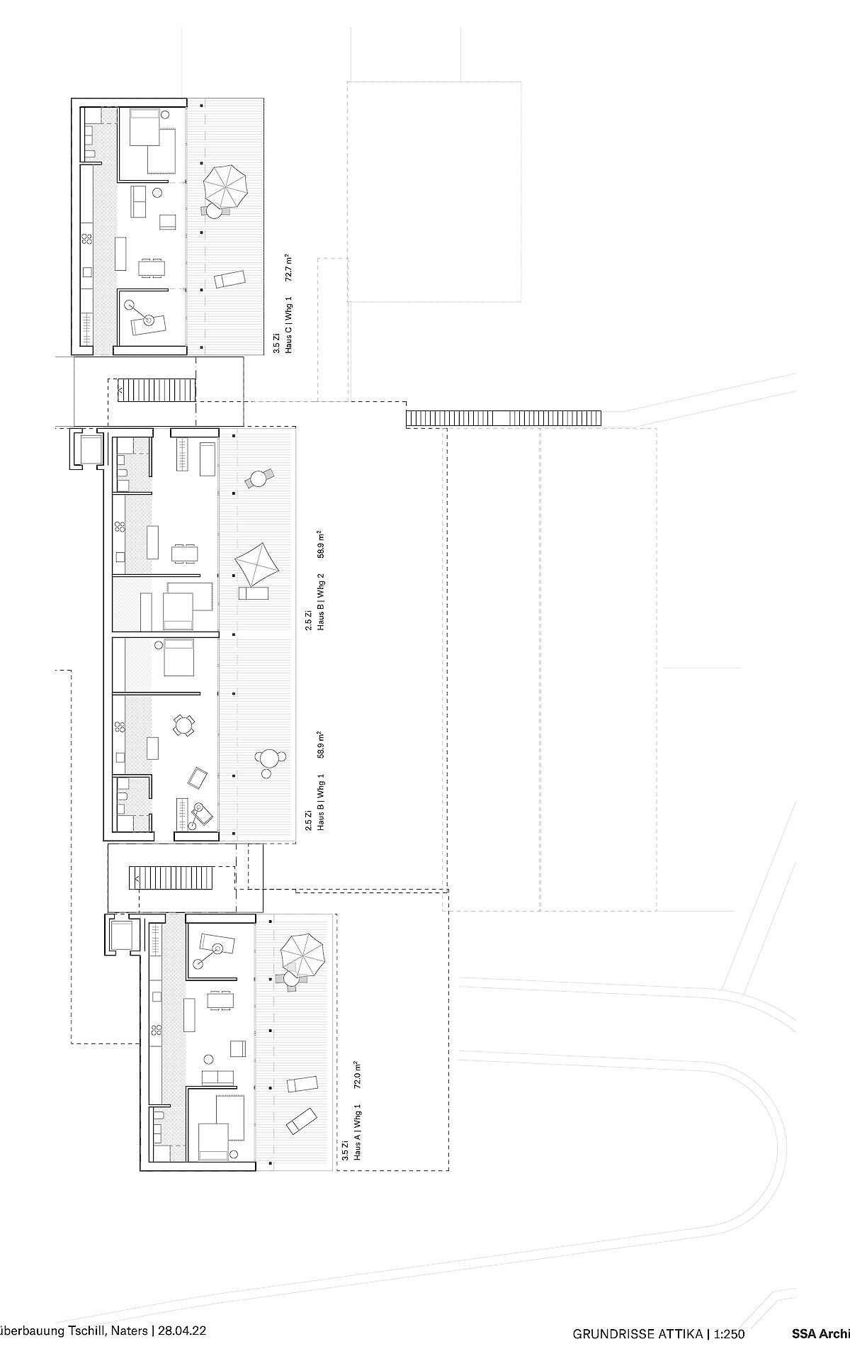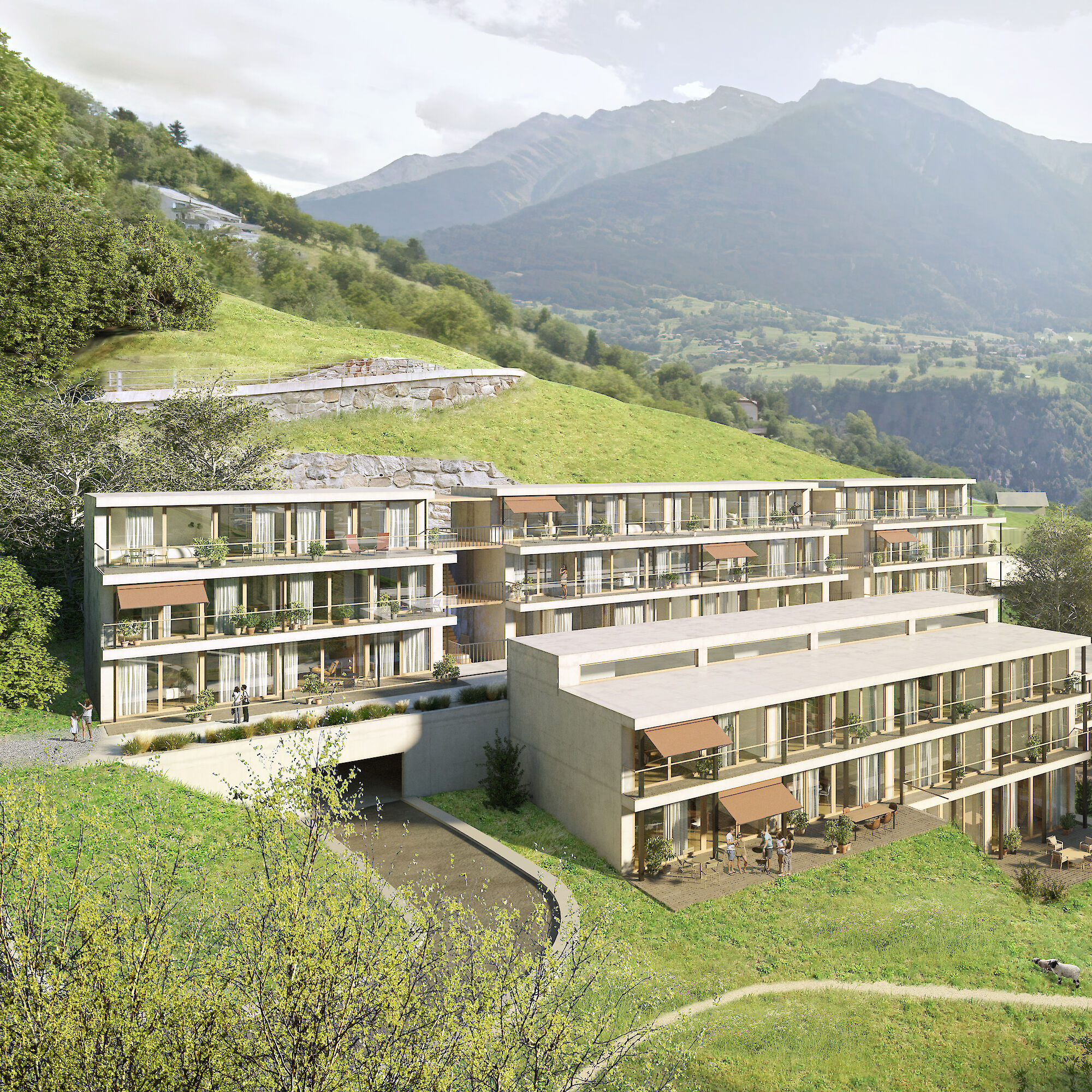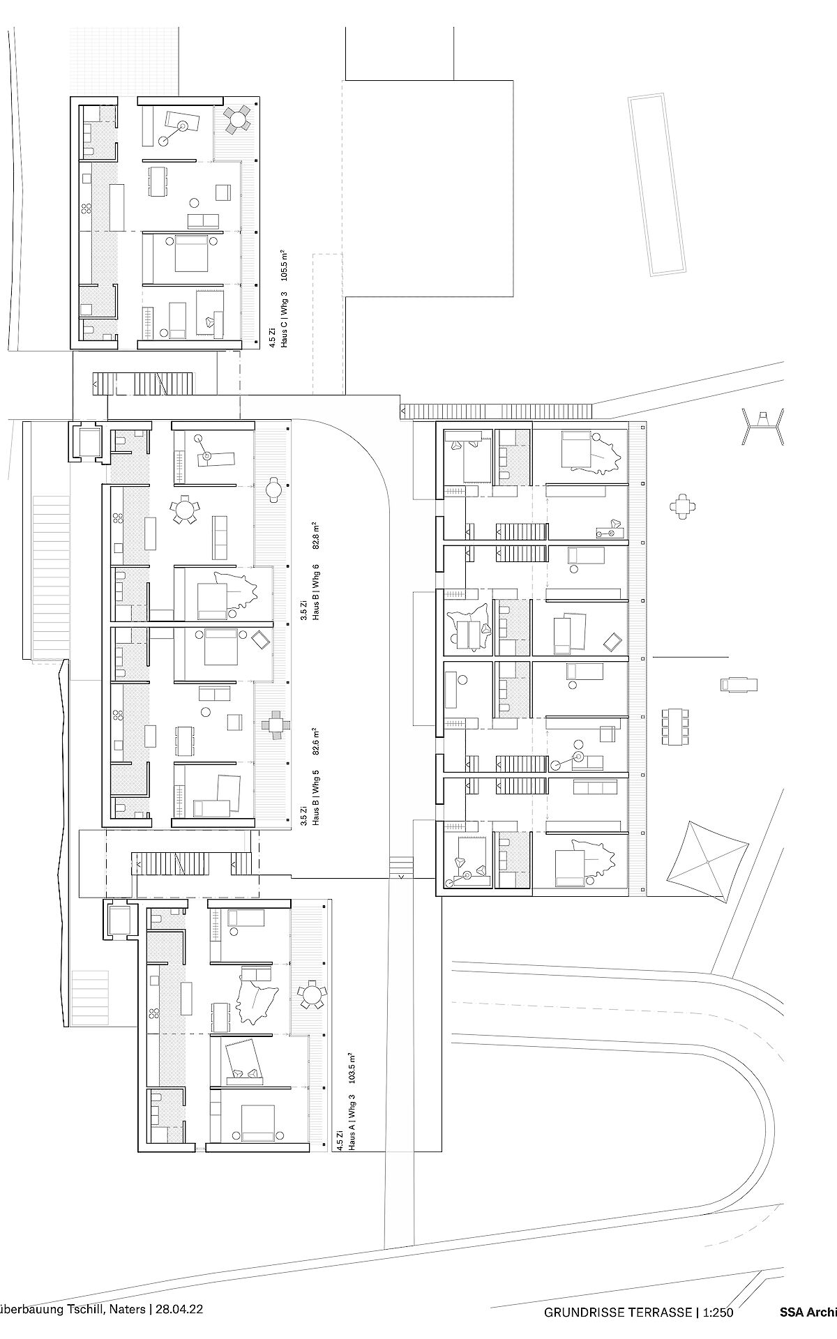 Aufgrund dieser ortsprägenden Topographie wurde eine spezielle Bebauungsform gewählt. Die Erschliessung der Bebauung erfolgt ab der Haselmattstrasse. An die bestehende Stützmauer der Strasse schliessen zwei mehrgeschossig Volumen, die sowohl Maisonette wie auch Geschosswohnungen aufnehmen, an. Zwischen den Bauten führt eine halboffen Treppenanlage auf die untere, zwischen den beiden Häuserzeilen liegende Ebene. Ab dieser Ebene werden die vier Reihenhäuser erschlossen.
