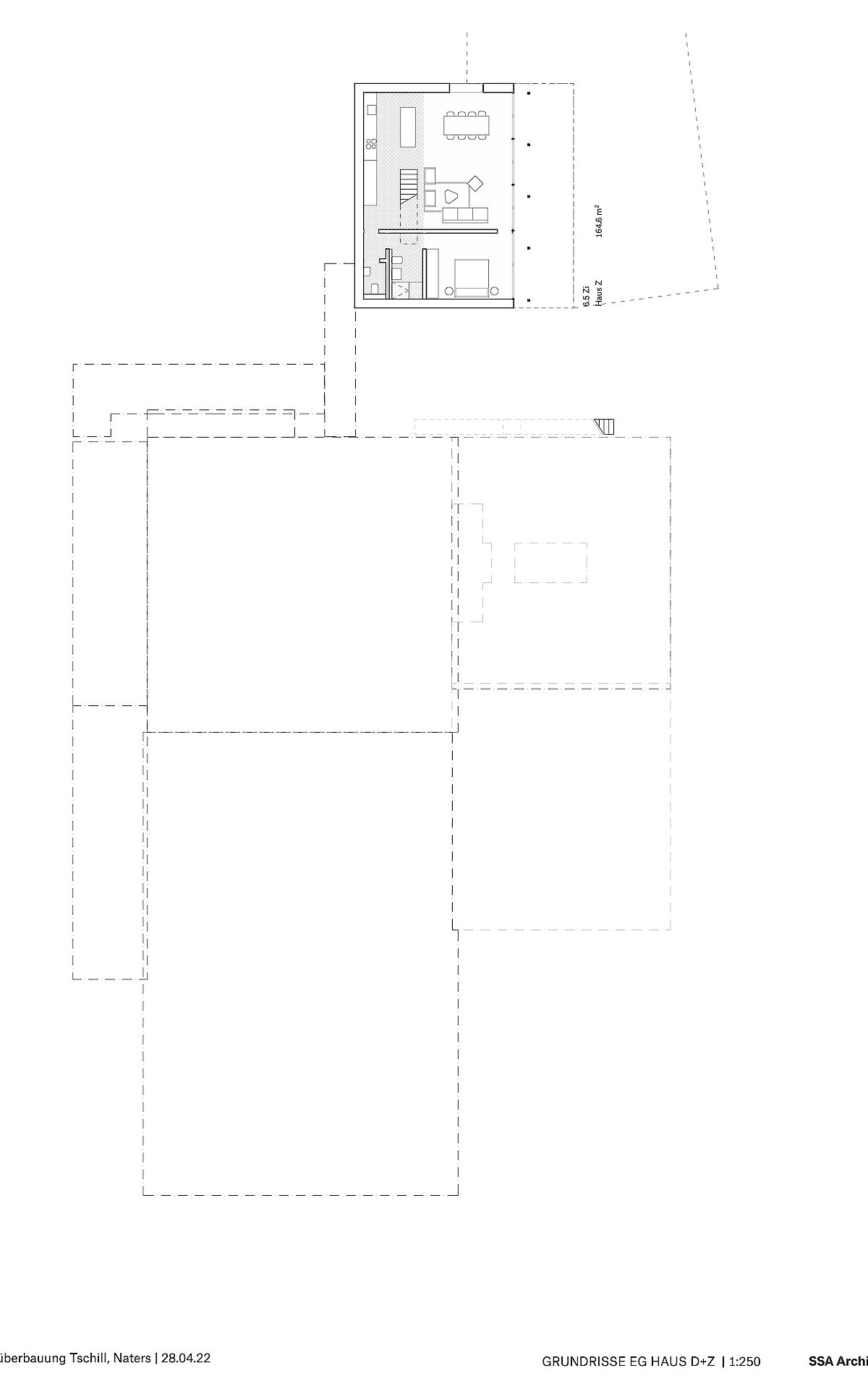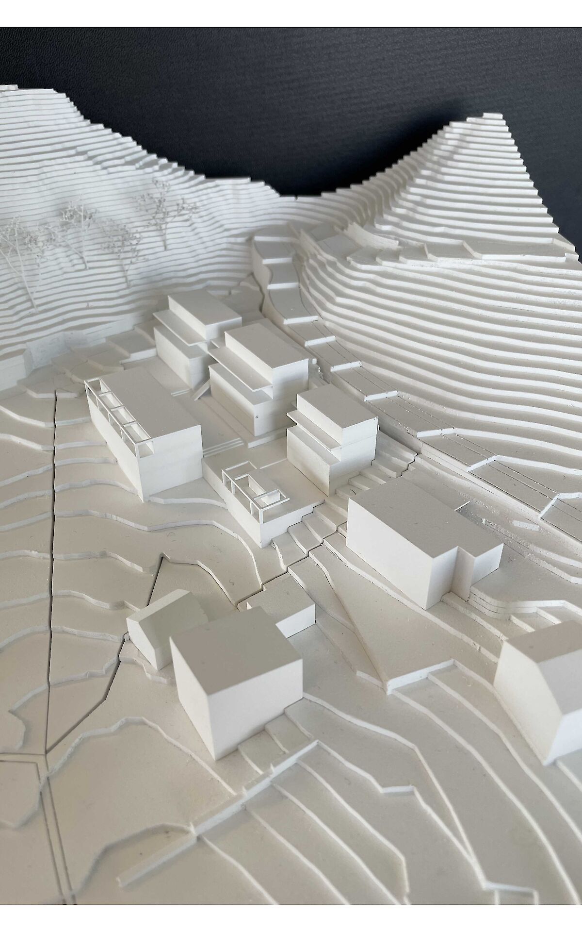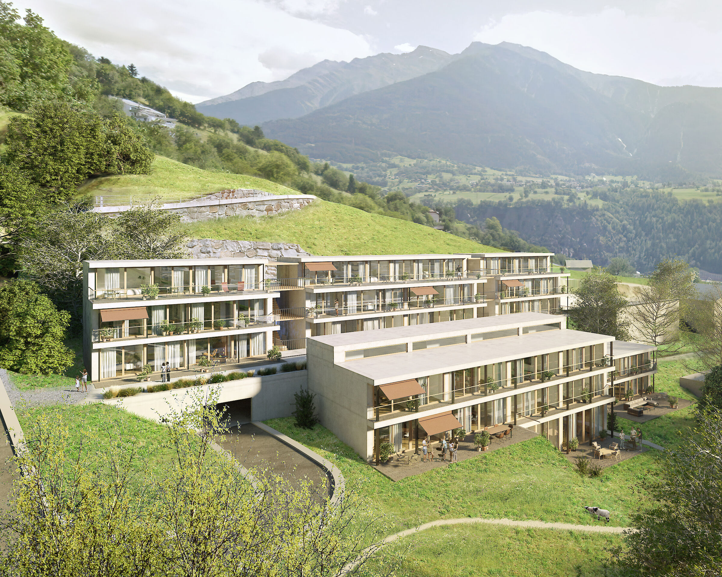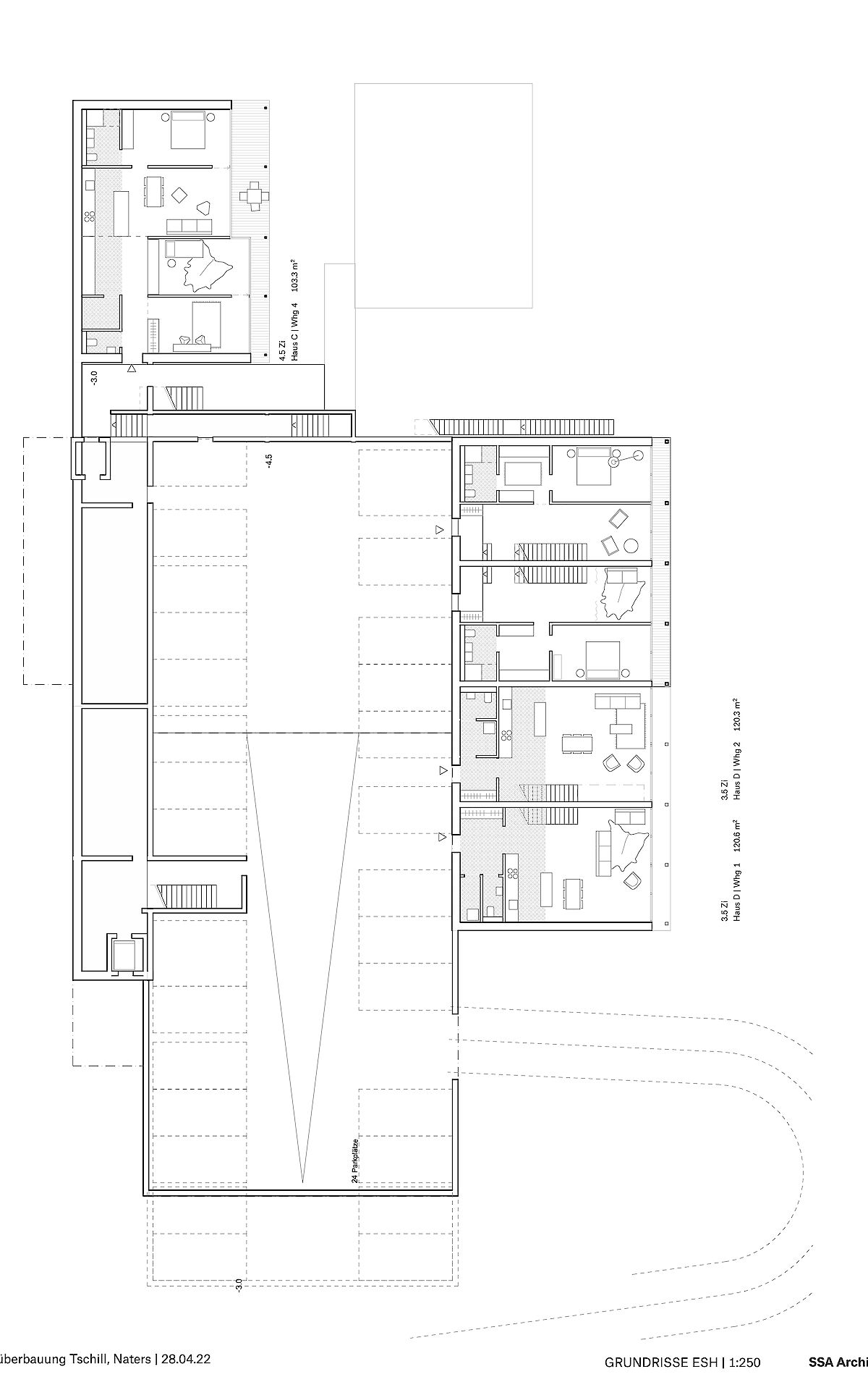Aufgrund dieser ortsprägenden Topographie wurde eine spezielle Bebauungsform gewählt. Die Erschliessung der Bebauung erfolgt ab der Haselmattstrasse. An die bestehende Stützmauer der Strasse schliessen zwei mehrgeschossig Volumen, die sowohl Maisonette wie auch Geschosswohnungen aufnehmen, an. Zwischen den Bauten führt eine halboffen Treppenanlage auf die untere, zwischen den beiden Häuserzeilen liegende Ebene. Ab dieser Ebene werden die vier Reihenhäuser erschlossen.